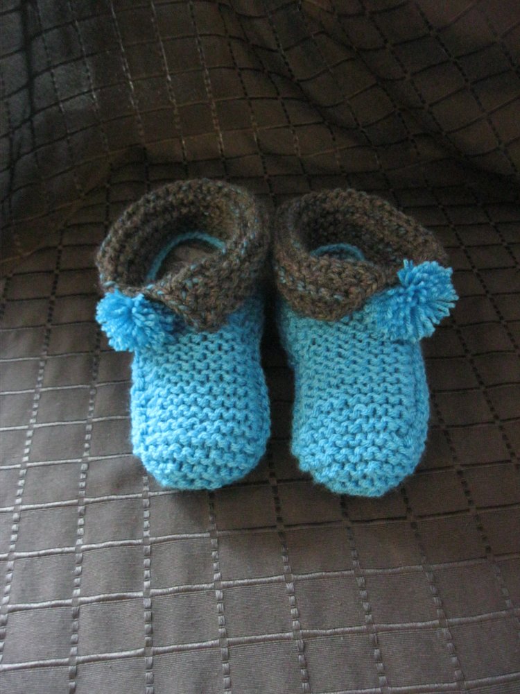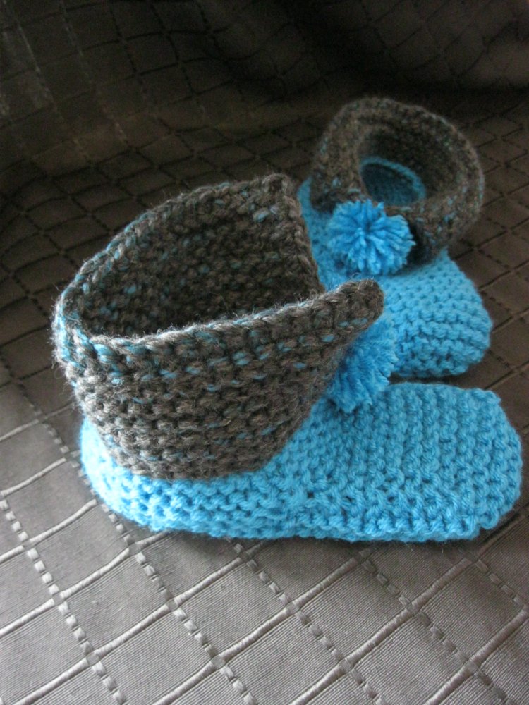 Gestrickte Hausschuhe/Socken mit Kontrastrand in Grau und Puschel.