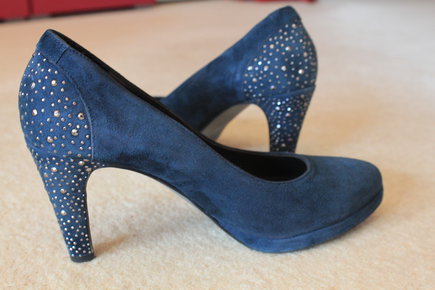 Diese dunkelblauen Wildleder Pumps von Maripé sind ein echter Hingucker! Habe sie leider nur einmal auf einer Kommunion tragen können, da ich an sich zu schmale Füße habe für Pumps habe. Aus diesem Grund sind sie fast wie neu. Schuhgröße ist eine 38,5, die Absatzhöhe beträgt 9cm, jedoch ist davon 1,3 cm Plateau. Ich habe generell in Sommerschuhen immer Größe 39, würde daher sagen dass sie etwas größer ausfallen.