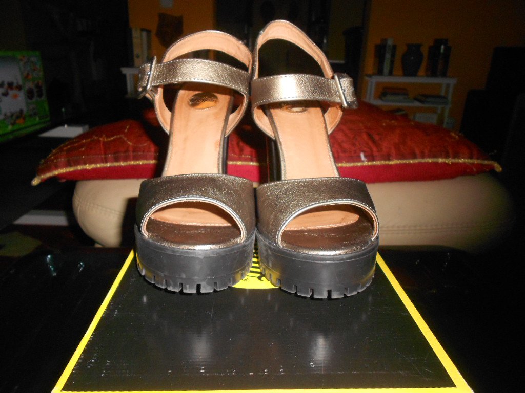 Die Sandalen wurden im Sommer 2018 gekauft, aber nur wenig getragen (2 oder 3 mal) und sind in entsprechend gutem Zustand. NP: 59,95€, Die Riemchen sind aus goldenem Leder. Die Sohle hat ein starkes Profil, so dass man recht gut in ihnen laufen kann. Der Blockabsatz ist 12 cm hoch. Material: Leder