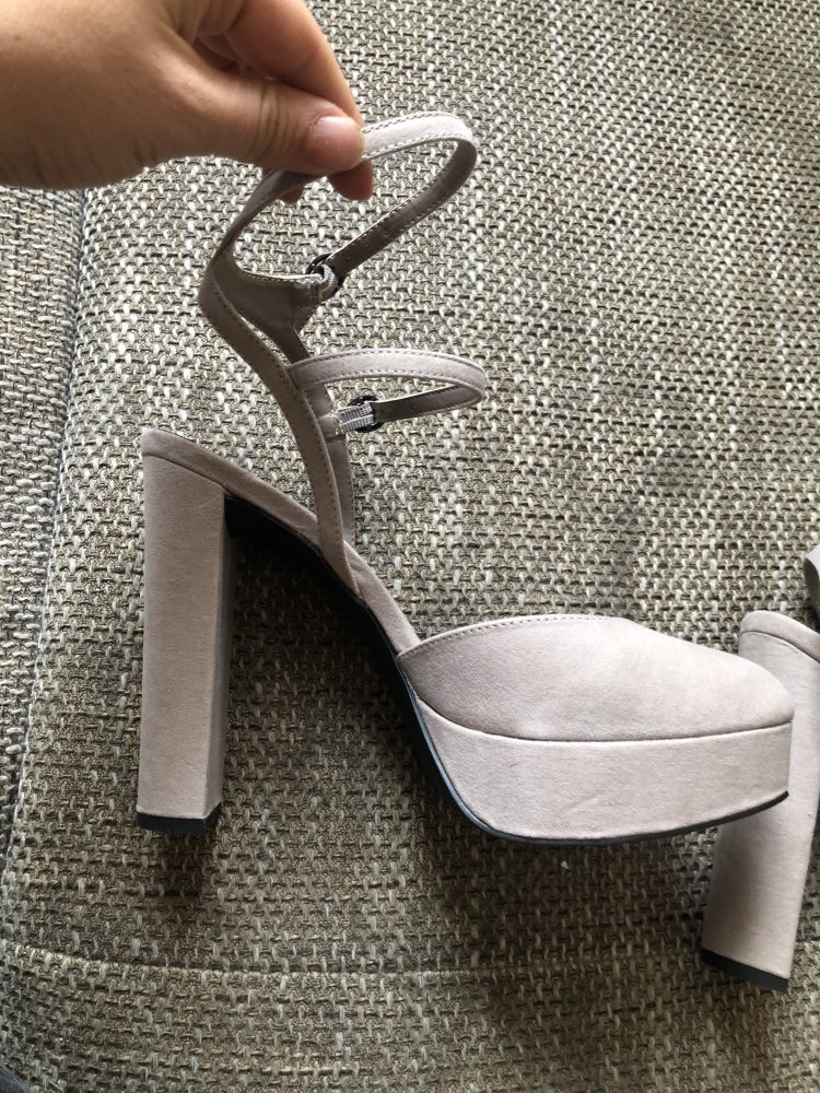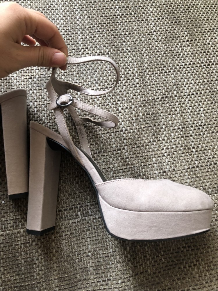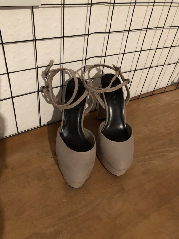 Biete hier wunderschöne Plateau Pumps in beigegrau von New Look. Die Pumps wurden nur einmal getragen. Der Absatz beträgt ca 13cm. Plateau vorne ca 2 cm. Riemen ca. 0,8cm breit.