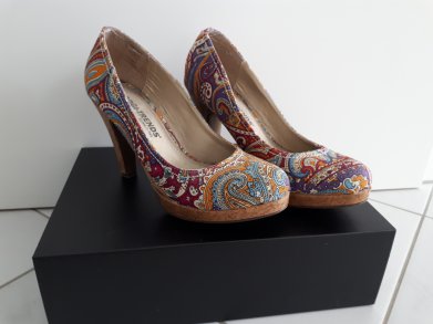 Ich biete hier hohe Pumps mit einem bunten Muster und Kork-muster am Ansatz und Sohle.