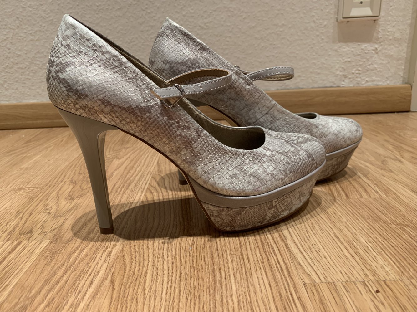 Besondere Plateaupumps von Tamaris in weiß/grau/Silber und Schlangenmuster; der Absatz hat einen schönen grauen Lack. Die Pumps wurden kaum getragen.