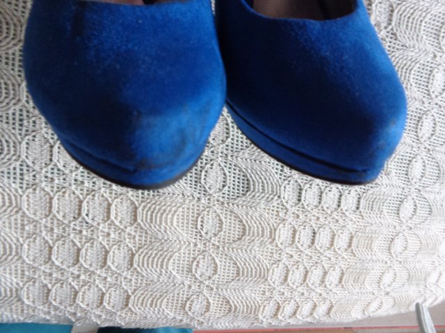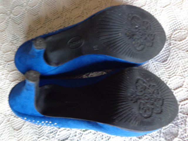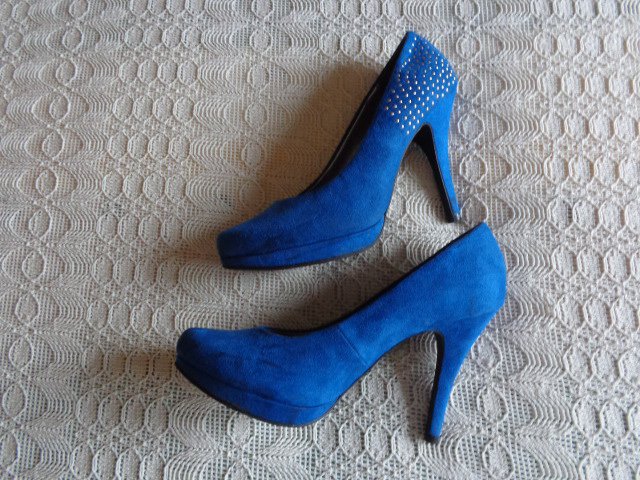 hübsche Pumps, Gr. 39, Graceland, royalblau, wildlederartig, an den Außenseiten sind hinten Nieten, einige Male getragen, normale Abnutzung, Absatzhöhe außen ca. 11 cm, innen ca. 8 cm, normale Abnutzungsspuren, am rechten äußeren Sohlenrand dunkle Stelle, 21,00 Euro, Versand 5,00 Euro möglich, zeitnahe Antwort,