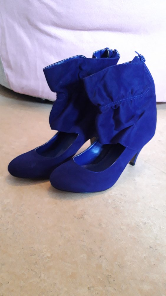 Samtige blaue Pumps mit keine Ahnung, wie man das Ding um den Knöchel nennen soll ????
