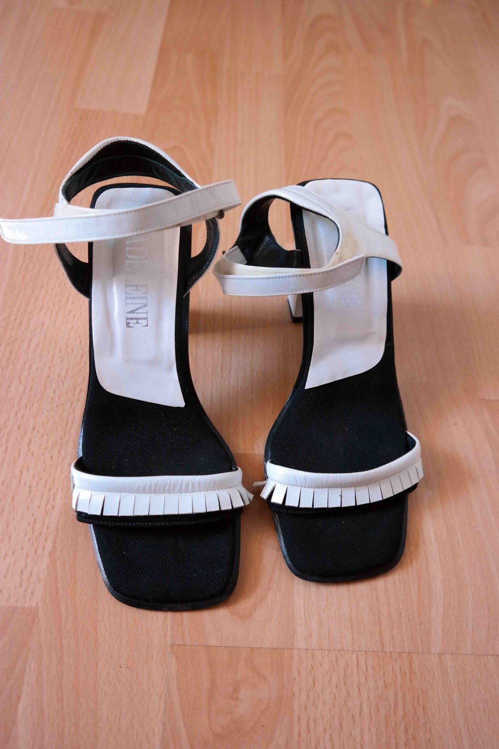 Wie NEU Original Madeleine True Vintage 90er 00er Sandalen High Heels Leder Echtleder weiß schwarz Blockabsatz Y2K 39 Fransen