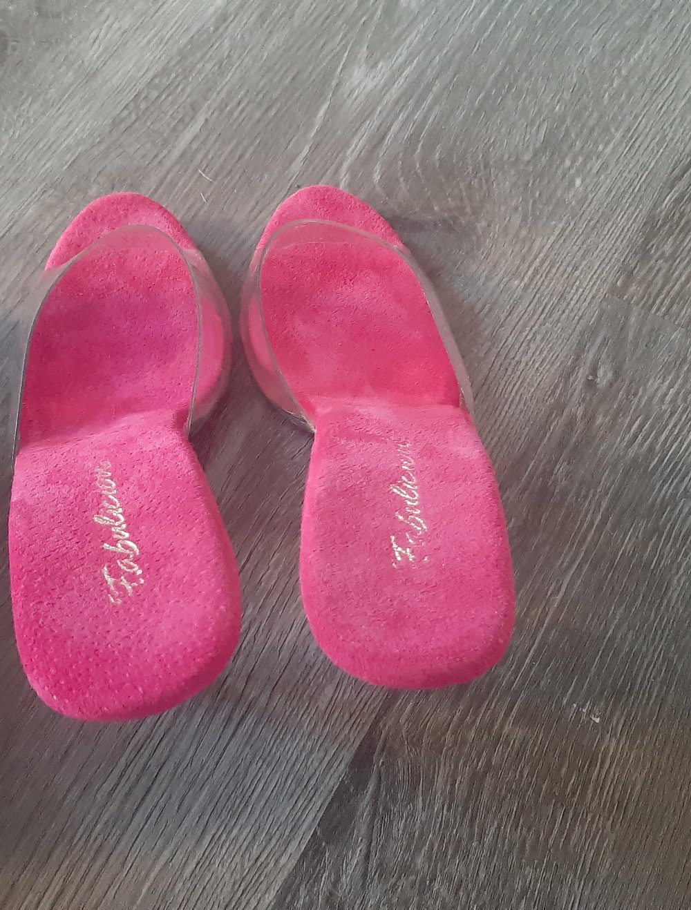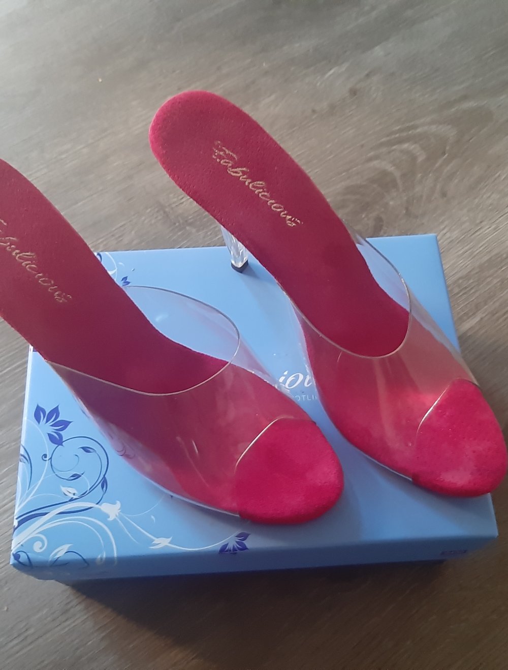 Einmal kurz getragen. Passen bei Gr.38. Absatz gefüllt mit kleinen Rosen.Transparentes Oberteil, klarer Absatz, gepolstertes Innenteil . Zuzüglich 4,79 Euro Versand. Paypal Zahlung möglich
