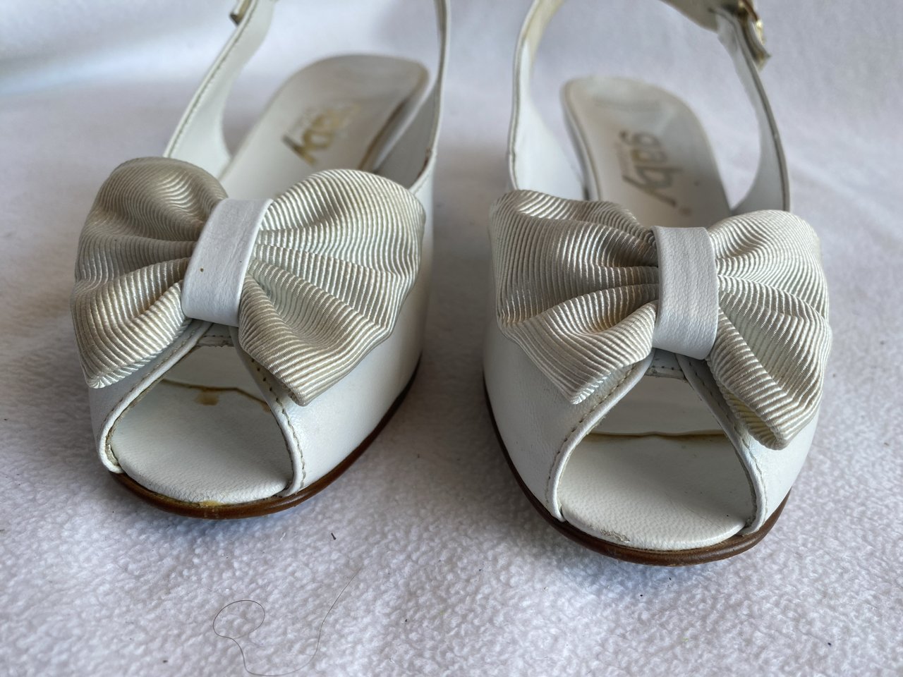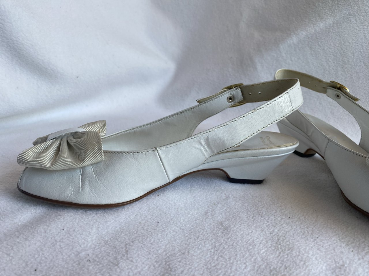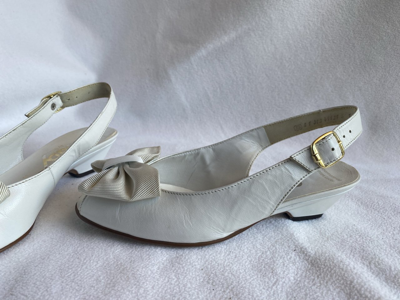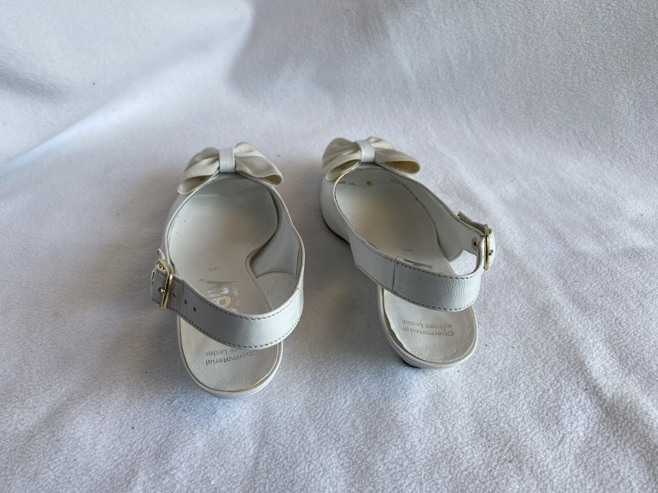 Zustand siehe Fotos/Detailfotos. Der Lederkleber ist an den Bindestellen teilweise sichtbar aber kann entfernt werden. Ebenfalls ist eine der beiden Schuhschleifen an einer Stelle leicht vergilbt.