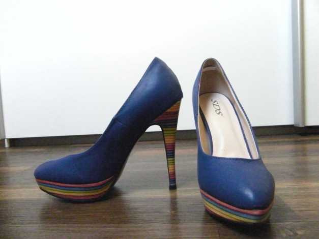 Sie sind in einem kräftigen blau mit Regenbogenabsatz in gelb, rot, blau und grün das Plateau ist in denselben Farben in Größe 36.