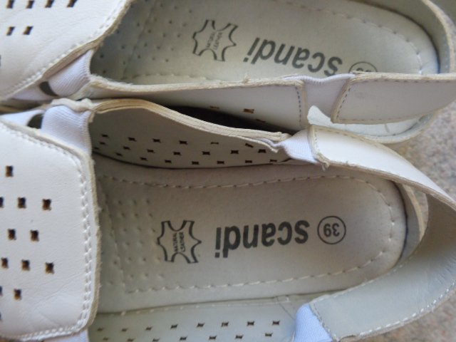tolle Damenschuhe, Slipper, Frühling-/Sommerschuhe, Gr. 39, weiß, Marke Scandi, Echtleder, Cutouts, optimale Luftzirkulation, Gummizugeinsätze, die Decksohle ist angenehm gepolstert und die profilierte Synthetiksohle gibt guten Halt, perfekter Allrounder für die warme Jahreszeit, oder auch im Haus?, ca. 4 cm Absatz, toller Zustand, 22,00 Euro,