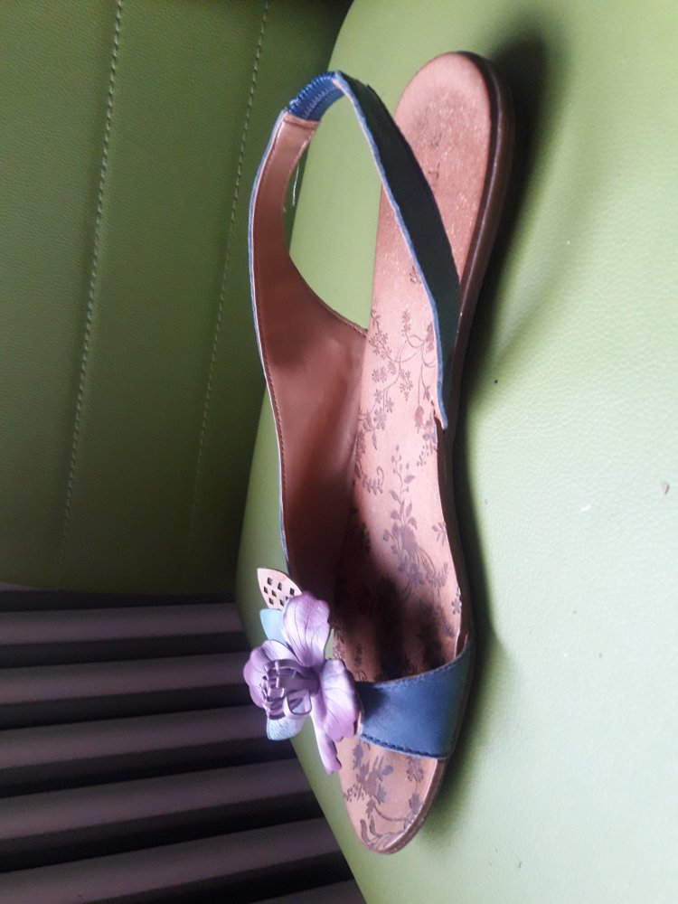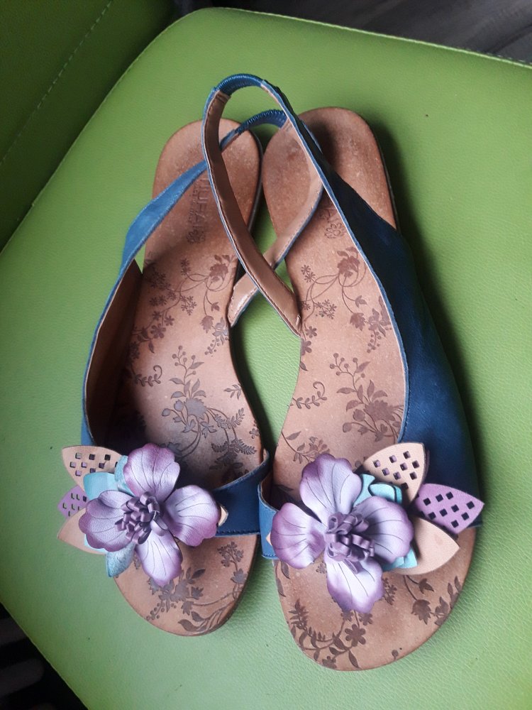 Asymetrisch geschnittene mittelblaue flache Sandale mit elastischem Fersenriemen, Zehensteg und wunderschönen lila Blüten.