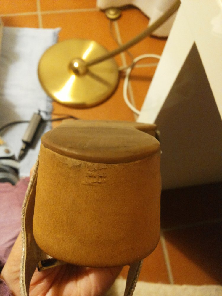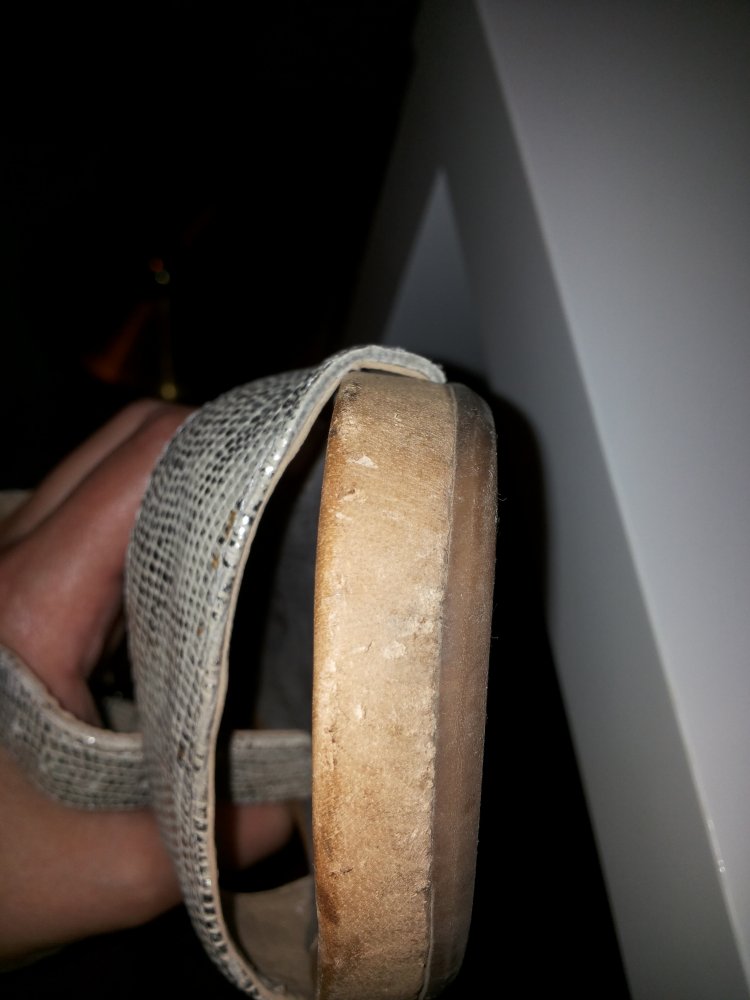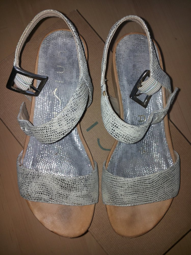 Zustand: Wie auf den Fotos zu sehen: vorne Abwetzungen, an einem Schuh auch hinten am Absatz. Auf dem silbernen Muster sind vereinzelt rötliche Flecken, die ich mit Wasser nicht wegbekomme, fällt aber kaum auf. Seitlich an der Sohle auf dem linken Schuh Flecken.