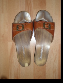 Der Klassiker: 'Klapperlatschen' von Berkemann in braun, Riemen aus Kalbsleder (gepolstert, sehr weich) , Holzsohle, wenig getragen, leider ist ein Stück Holz hinten rausgebrochen, seitlich genietet,Absatzhöhe:3,5 cm, leichtes Plateau--- NP: 70 Euro