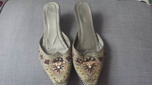 Verschenke meine Aladin Schuhe. Sie sind aus grauem, besticktem Stoff und weisen Gebrauchsspuren auf. Speziell an den Absätzen. Da befindet sich links ein dunkler (Klebstoff) Fleck. Jedoch für Mottoparties oder Karneval top! ;)