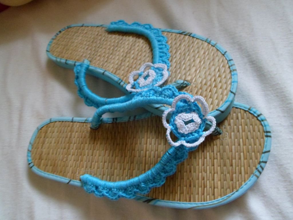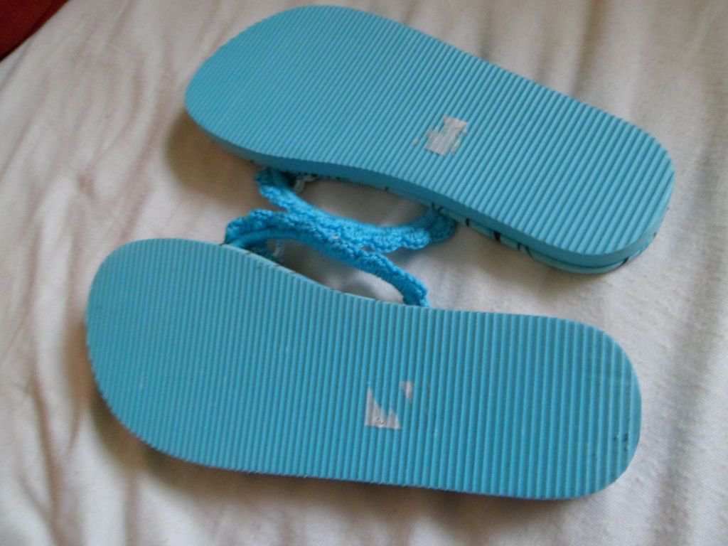 Türkise Sandaletten für den Strand oder auch für zu Hause, geschätzt Größe 38 ;) Die Riemen sind selbst umhäkelt, auch die Blume vorne drauf ist selbst gemacht. Wurden nur einmal kurz getragen und sehen daher noch neuwertig aus.