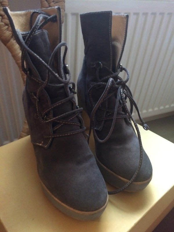 In steingrauem/ schokograuem Wildleder, Innensohle und Fußbett aus hochwertigem Glattleder, aufwendig bezogene Platteau- Absätze und Lederschnürrsenkel.