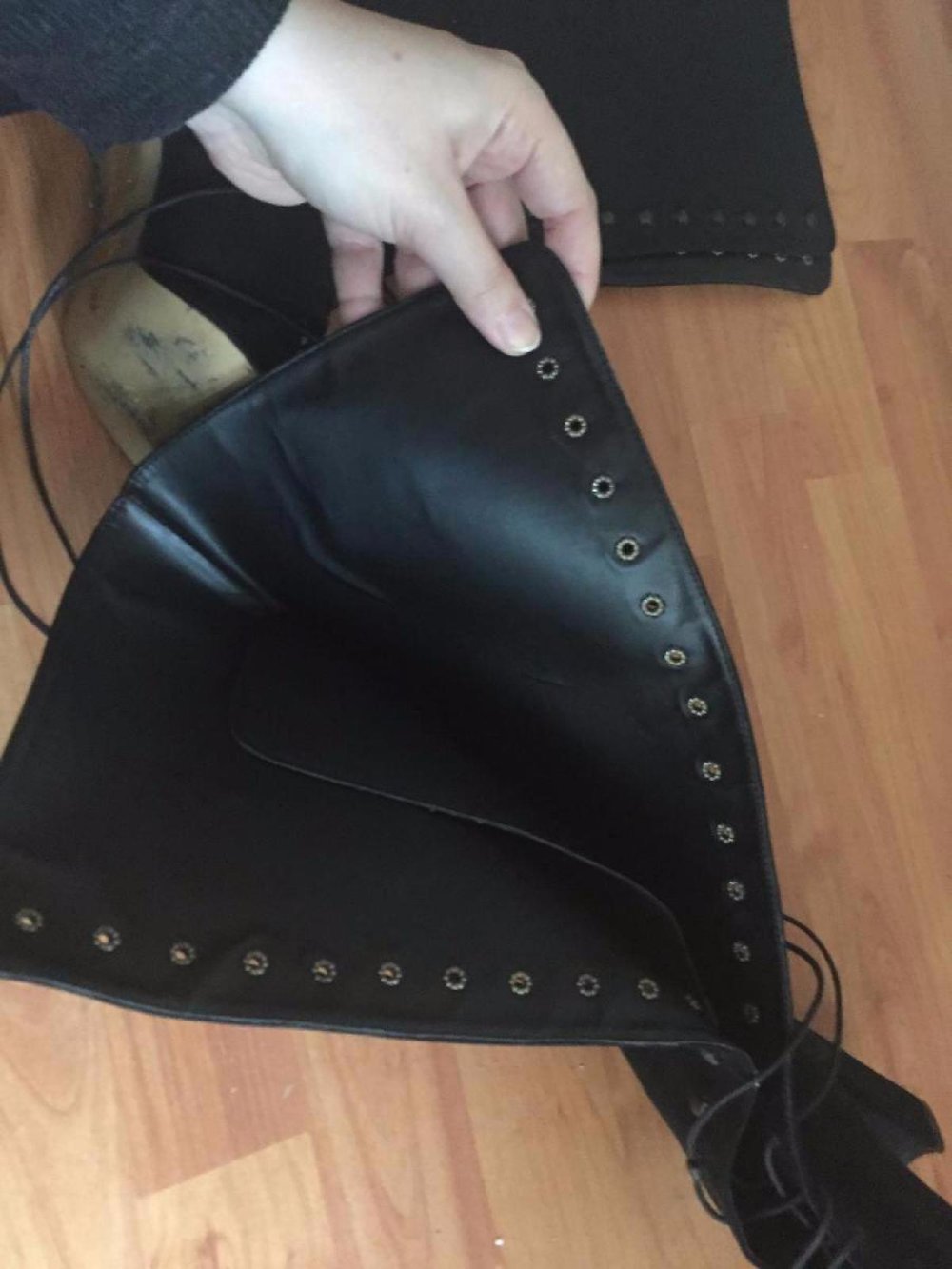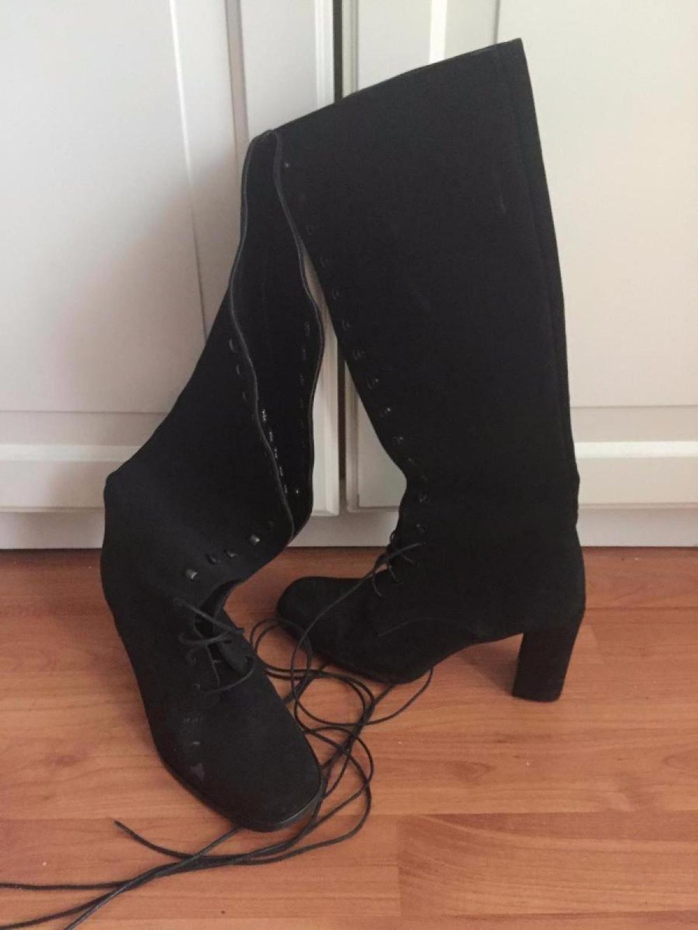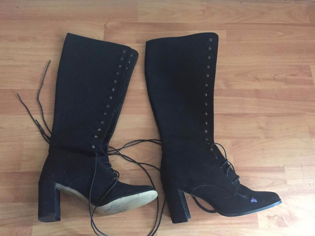 Blockabsatz, vorne leicht eckig. Geschnürt mit dünnem Senkel und dunkelen Metallösen (gehen Richtung Messing)