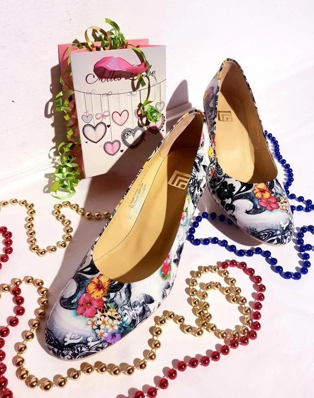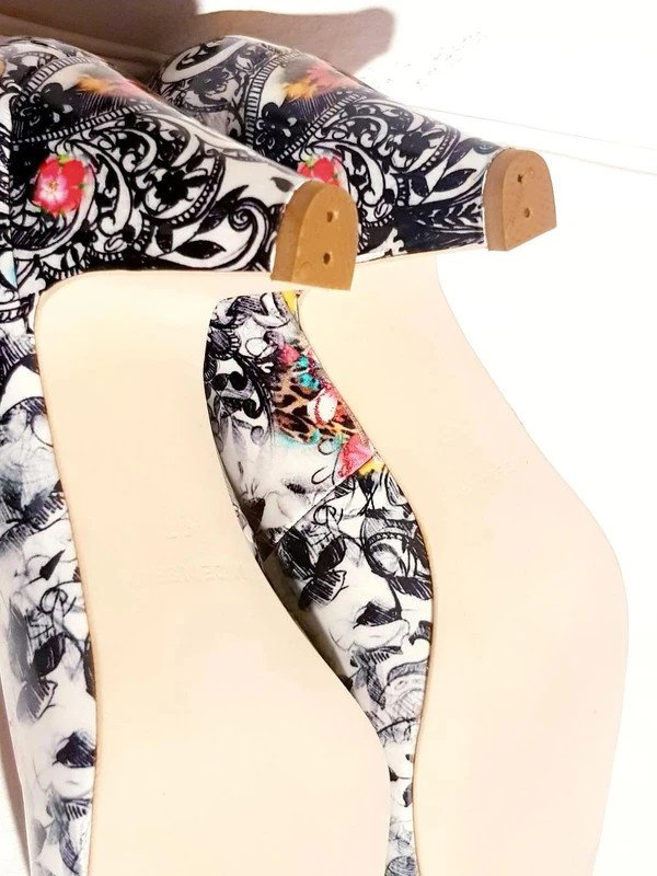 Ein wunderschöner,eleganter hochwertiger Pumps. Das fröhliche Blumenmotiv mit glitzersteinchen, und die im gebrochenen weiß gehaltene Basislage lässt jedes Outfit strahlen.