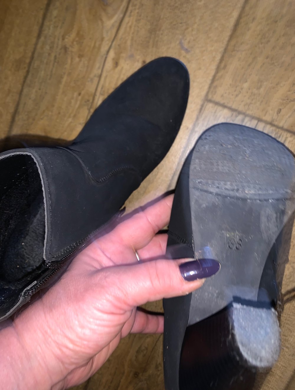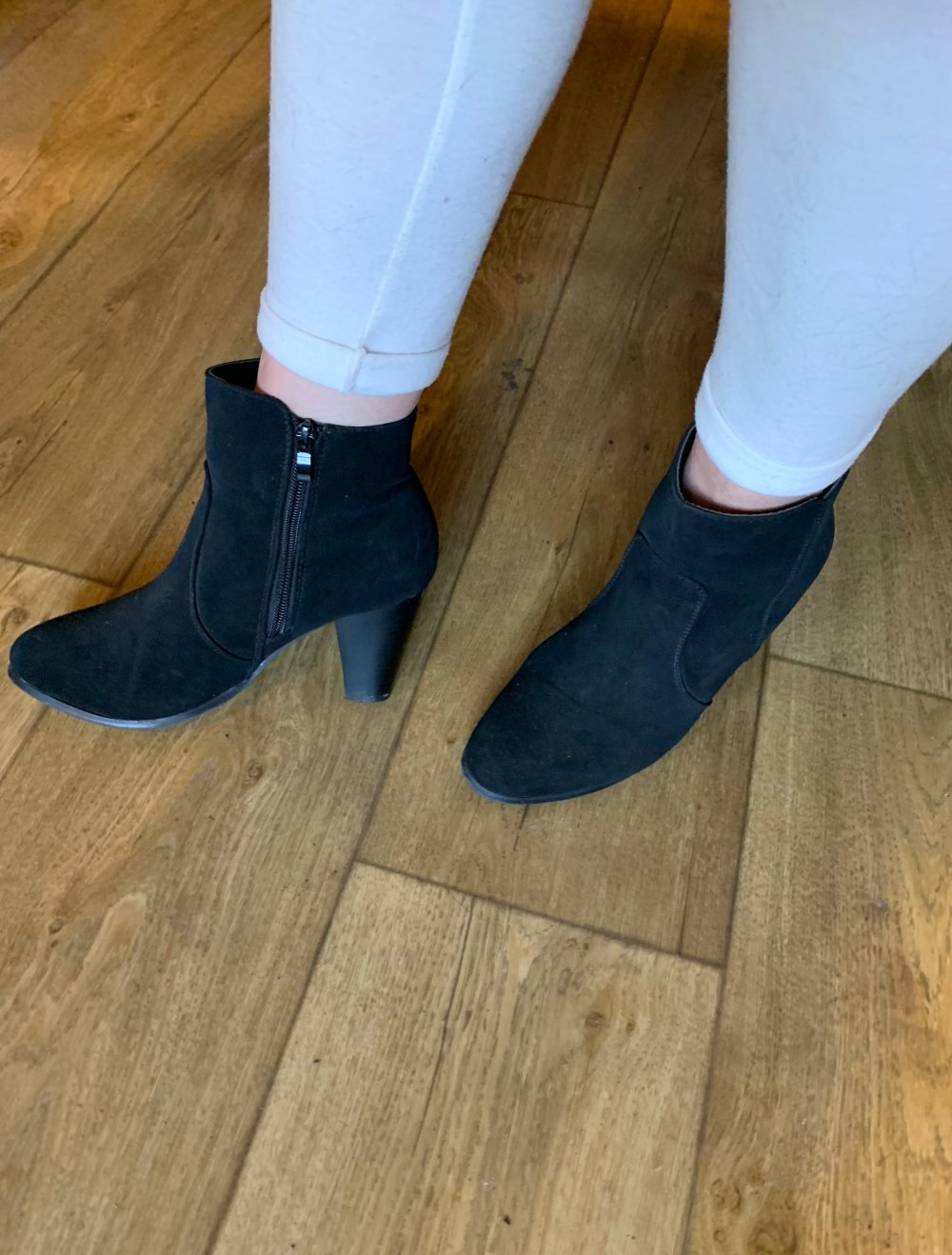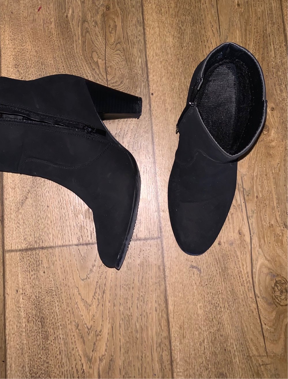 Die Stiefeletten sind sind in Wildlederoptik ,fast wie neu. Hab sie grad zwei Abende getragen und jetzt gehts nach ner Fuß Op von der Höhe her nicht mehr.
