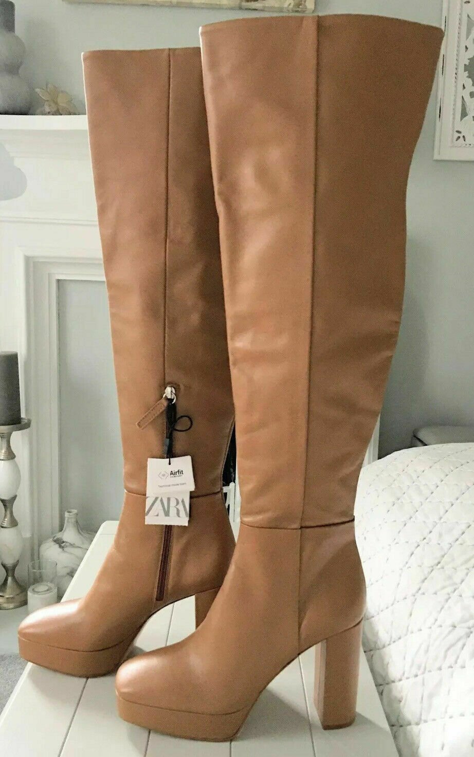 Überknie ZARA Plateau Overknee Glattleder Stiefel hellbraun braun 40