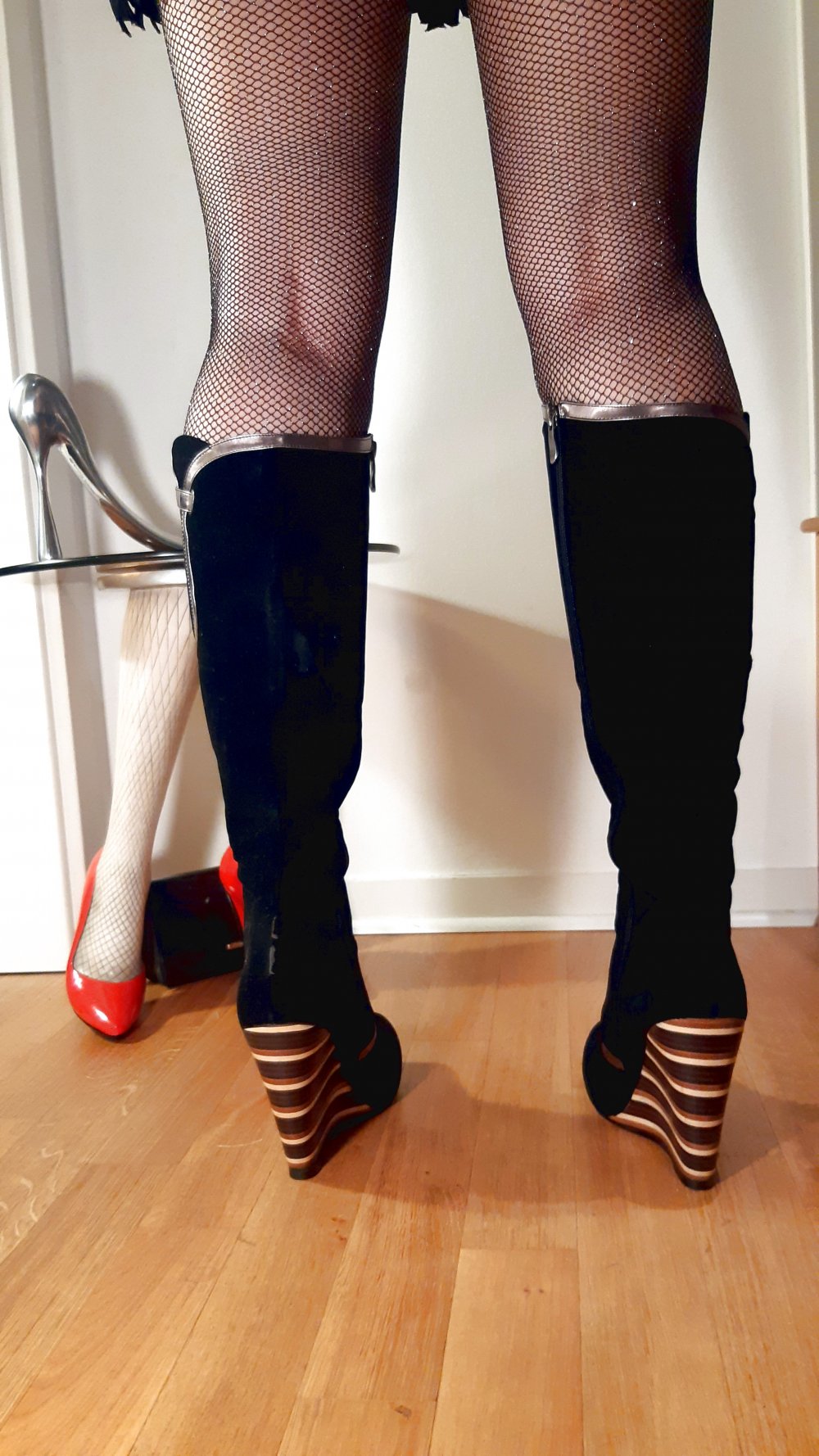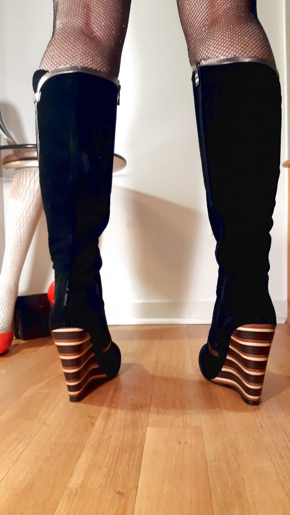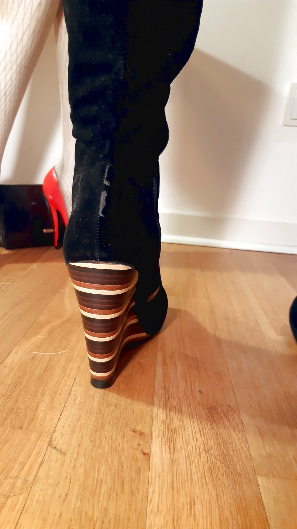High Heel Stiefel Hippie Boho schwarz gestreift 60s Keilabsatz velour Plateau 39