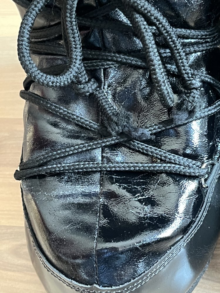 Y2K etwa 25 Jahre alt, wenige Male getragen, allerdings alters-/materialbedingte Gebrauchsspuren (cracking) am Lack und an der Sohle, siehe Fotos.