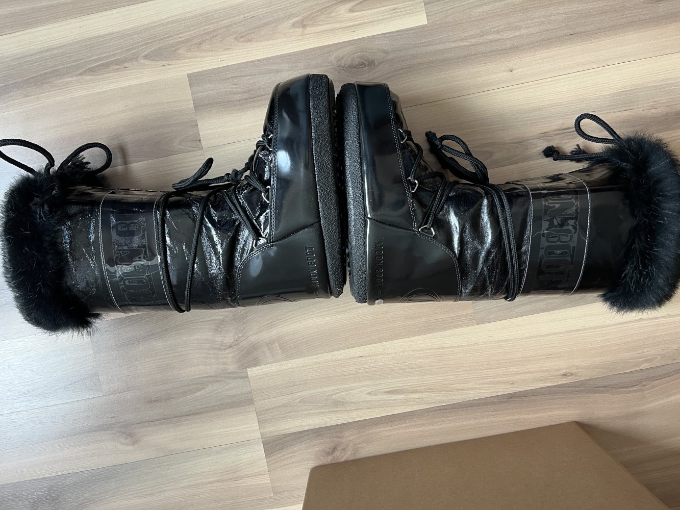 Schwarze Moon Boots in Lackoptik aus der Fashion Linie von Tecnica mit Fell am Schaftrand.