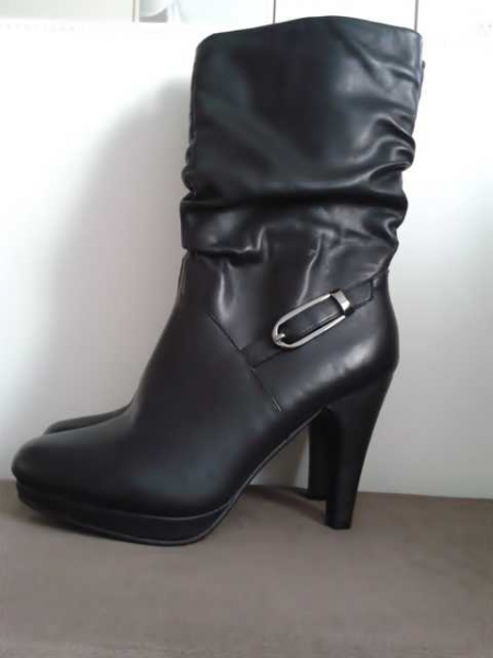 Mit robuste Absätze und feine dunkle Schnalle. Ca. 9 cm Absatz und 1 cm Plateau vorne. Mit Reißverschluß.