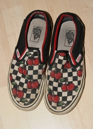 Gut erhaltene VANS Slip-Ons mit Karo und Kirschen. Wurden nur selten getragen, Mängel sind auf den Bildern zu erkennen, noch super tragbar. Keine Löcher in den Sohlen!