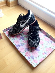 Tolle, supergemütliche Sneaker von Nike. Sind ein echter Hingucker! Kaum getragen, daher nur leicht abgenutzt hinten (siehe Bild). Rosa-rote Sohle und Nikeschrift hinten, mit helllila Fäden auf dem weißen Nikezeichen. Überall weiße Pünktchen auf schwarzem Hintergrund.