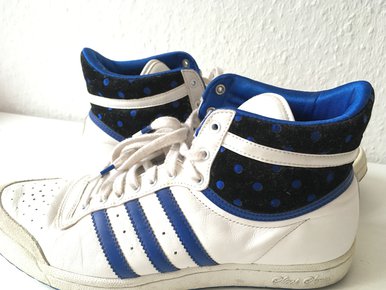 Ich verkaufe meine Lederschuhe von Adidas. Wie auf den Fotos zu sehen, haben sie am Knöchel schwarzen Stoff mit dunkelblauen Punkten. Sie sind sehr schön und super bequem und weisen übliche Gebrauchsspuren auf. Wie bei Adidas üblich, fallen sie eher wie eine 39 aus.