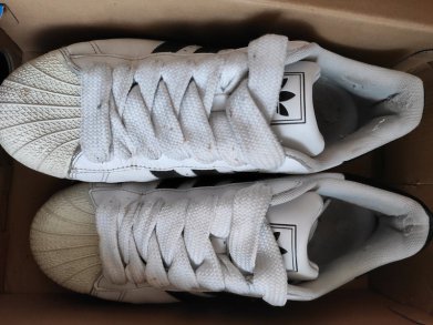 Biete ein Paar Adidas Superstar II mit Fat Laces. Die Schnürsenkel gehören nicht zur Regelausstattung der Schuhe, werden jedoch mitgeliefert. Der Originalkarton ist dabei. Die Schuhe wurden getragen, Gebrauchsspuren sind daher vorhanden. Vielleicht mag sie jemand "zu Ende" tragen. Sohle, Kleber und Nähte sind völlig intakt.