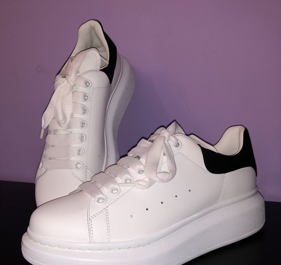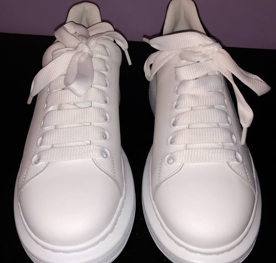 Diese klassische Kollektion kommt in einer monochromen Version der ikonischen Zwischensohlen-Sneaker des Labels mit einer breiteren, vorstehenden Sohle. Der Designer entschied sich bei diesem Paar für weißes, mattes Glattleder. Der Absatz hat ein Obermaterial aus schwarzem Samt und Wildleder mit dem in Gold geprägten Logo der von Alexander McQueen gegründeten Marke.