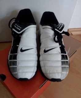 Selten getragene Sportschuhe von Nike Air Max Total 365 (wie man unschwer an der Sohle sehen kann) in der Farbe white/black. Das Material ist Synthetik, sieht aber aus wie hochwertige Lederoptik mit schönen Quer- und Längsnähten. Sehr schöne Schwarz/Weiß-Musterung.