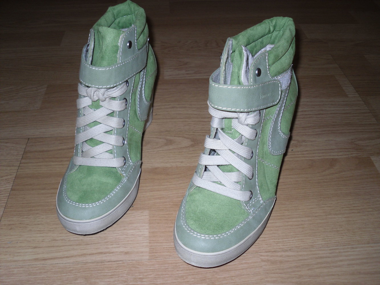 Top gepflegte Wedges von Tamaris in Gr. 38 - nur an der Laufsohle Gebrauchsspuren, die halt nicht ausbleiben, wenn Frau sie auch anzieht - helles Grün, Mintgrün mit hellen Ziernähten- zum schnüren und mit Klettverschluss