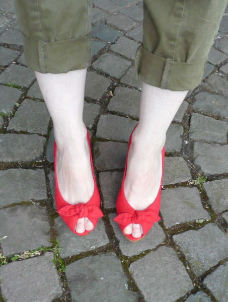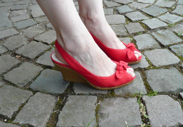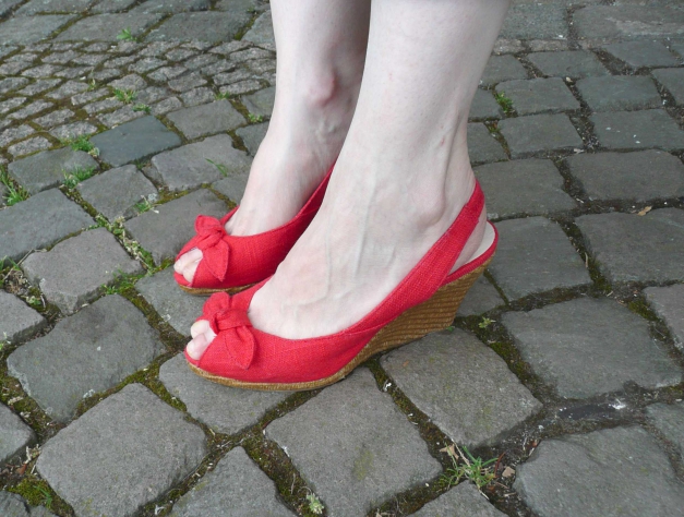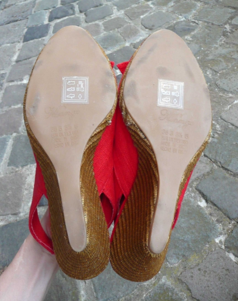 Mit Keilabsatz ( aus Sisal / Bast ?) und schönen Schleifen vorne.