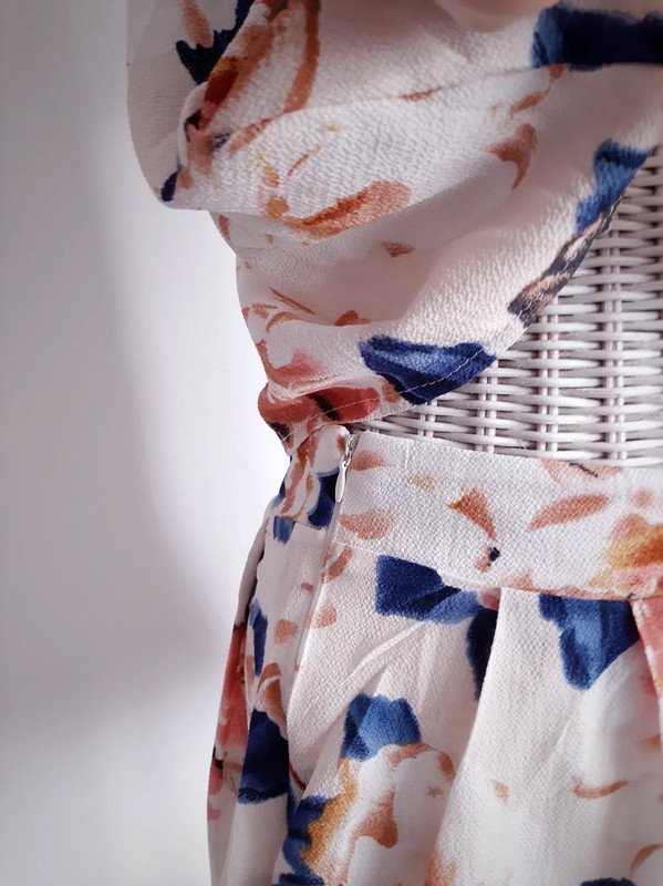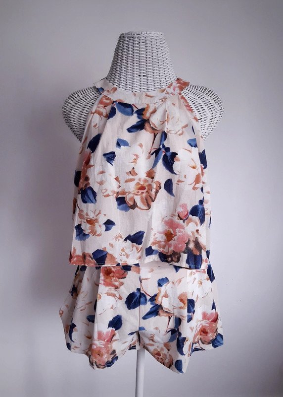 Kurzer Zweiteiler bestehend aus einem Top und einer kurzen Stoffhose mit Bundfalten und seitlichem Reißverschluss, das Top ist hochgeschlossen, im Nacken zum Binden in Gr. L (asiatische Größe), passt bei Gr. S/36 hervorragend.