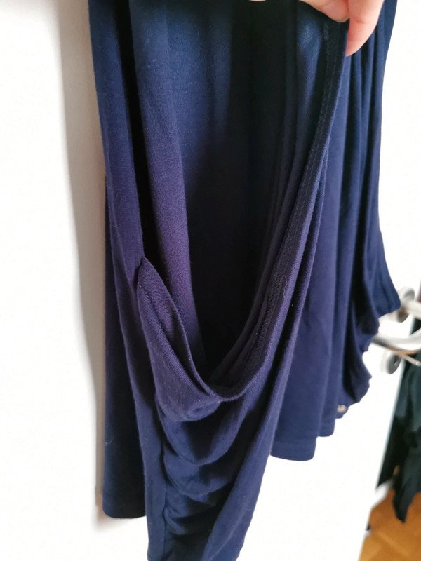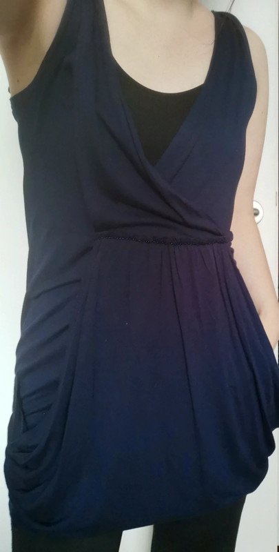 Blaue Tunika/Kurzkleid mit V-Ausschnitt in Wickeloptik, ist sehr weit ausgeschnitten, man sollte also etwas darunter anziehen ;) wird nach unten etwas weiter und hat dort eine Art durchgehende "Tasche", kaschiert perfekt kleine Pölsterchen. Gr. 40 - passt Gr. M/L Ist mir (auf dem Foto) zu groß, sitzt da also nicht optimal. Schöner weich fallender Stoff