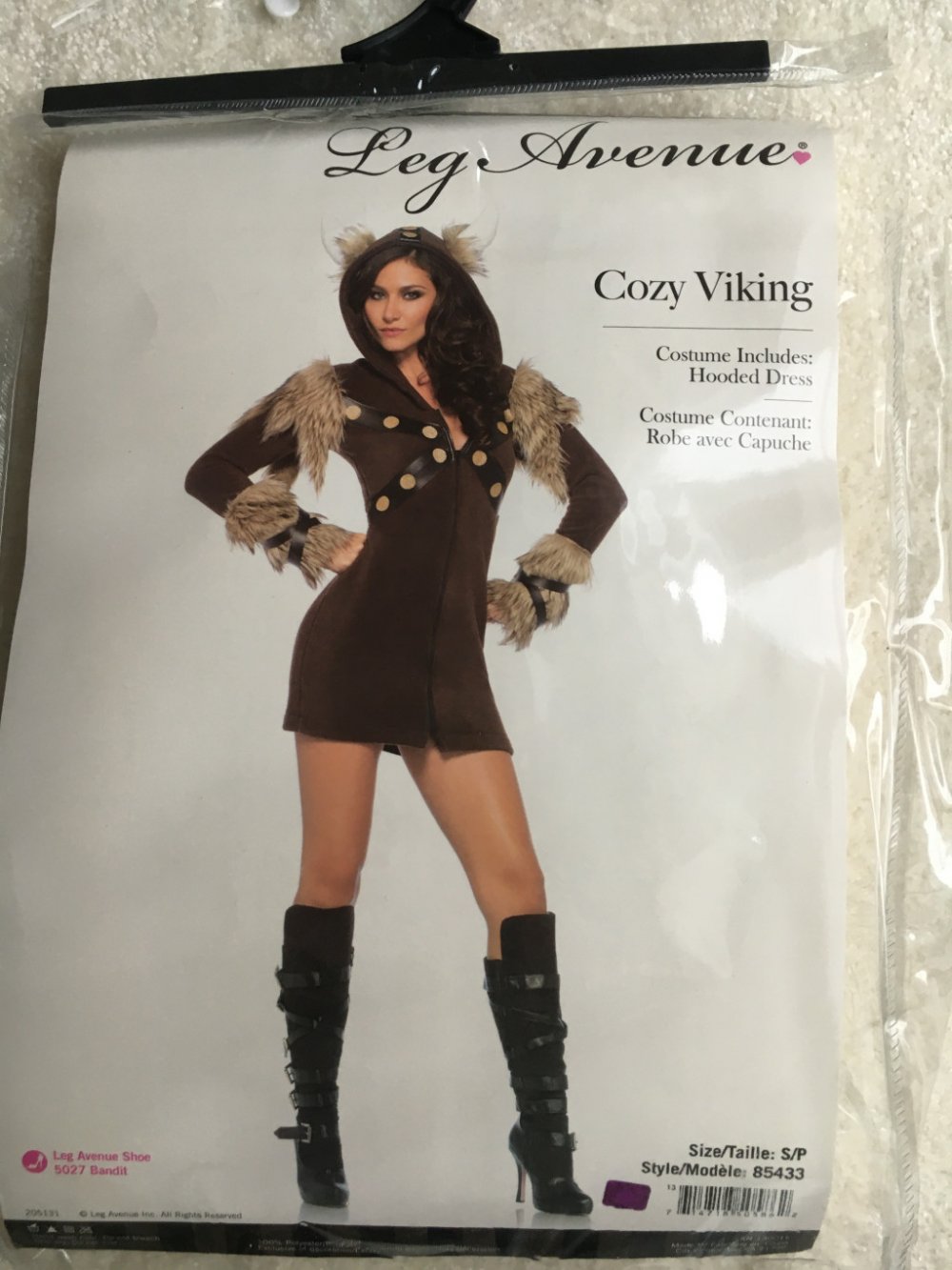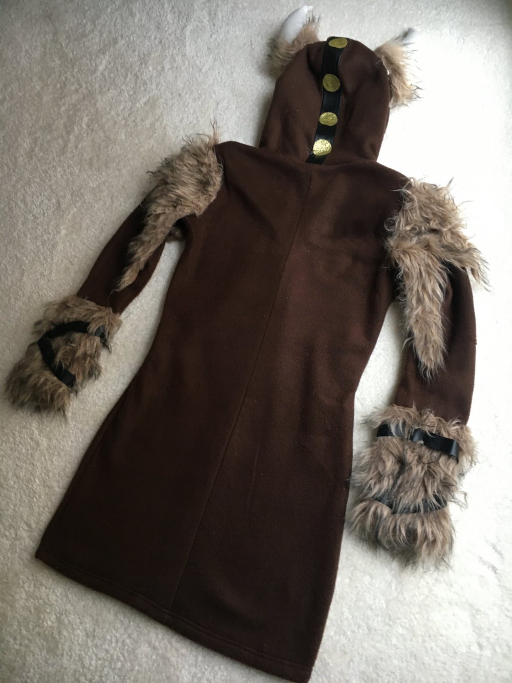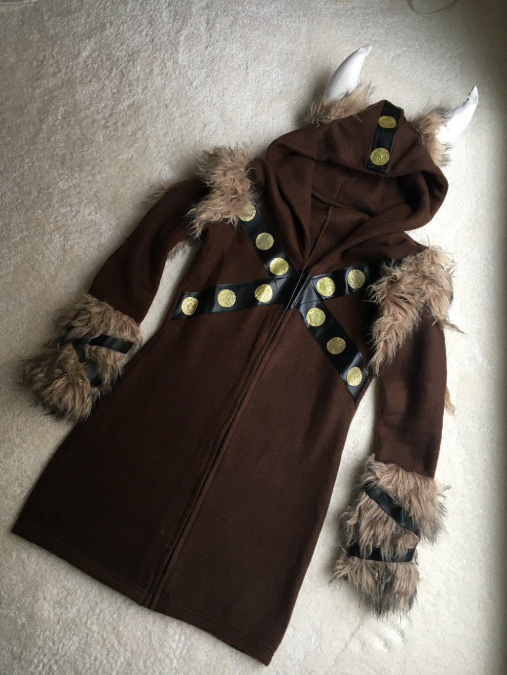 Einteiliger Wikinger Hoodie Dress. Wikinger Kostüm bestehend aus Kleid mit Kapuze und Kunstfell-Akzenten. Hörner auf der Kapuze, Reißverschluß. Flauschiger Stoff, dehnbar.