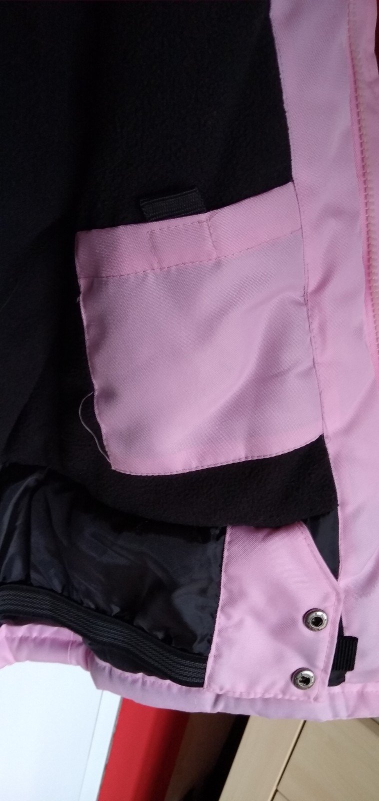 Die Jacke hat 2 Innentaschen, beide mit Klettverschluss verschließbar. Außen am linken Ärmel gibt es eine kleine Tasche mit Reißverschluss. Vorne auch ein Reißverschluss. Die Kapuze ist abnehmbar. Innen unten kann man die Jacke noch extra verschließen, damit von unten kein Schnee in die Jacke gelangt. Innen ist die Jacke mit kuscheligen Fleece ausgestattet.