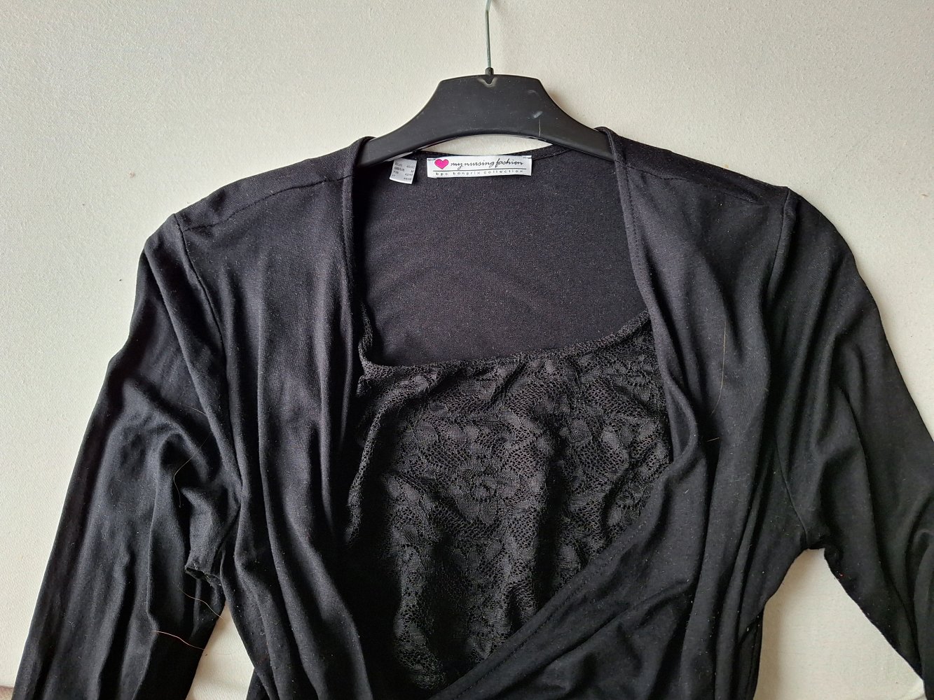 langärmliges schwarzes Wickel-Stillkleid / Wickel-Umstandskleid mit Spitze und Schleife Gr. 40/42