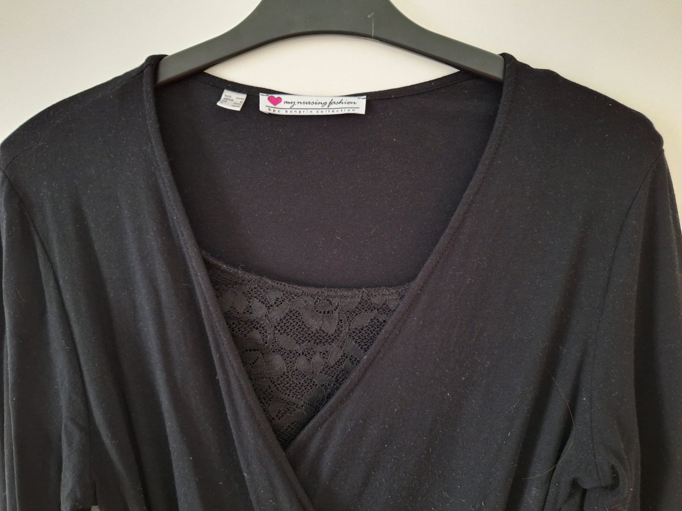 Wunderschönes langärmliges schwarzes Wickelkleid mit stillfreundlichem schwarzen Spitzeneinsatz Gr. 40/42. Außerdem total bequem und angenehm weicher Stoff.