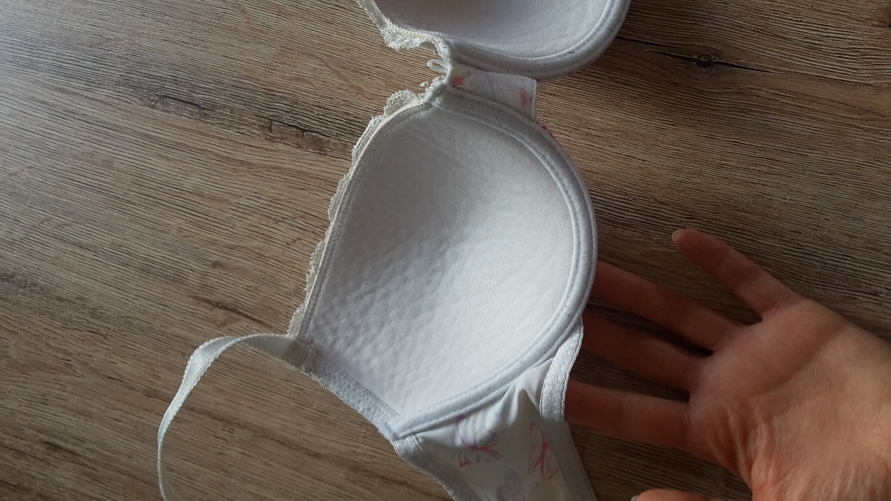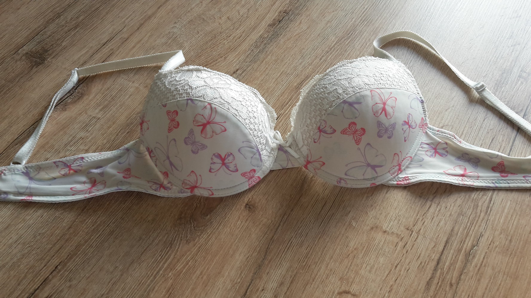 Süßer BH mit vielen Details, Größe 75B, weiß mit Schmetterling Aufdruck. Die oberen Ränder der Cups sind mit spitze versehen, die Träger haben kleine "mäusezähnchen" - einfach hübsch. Guter, getrager Zustand.