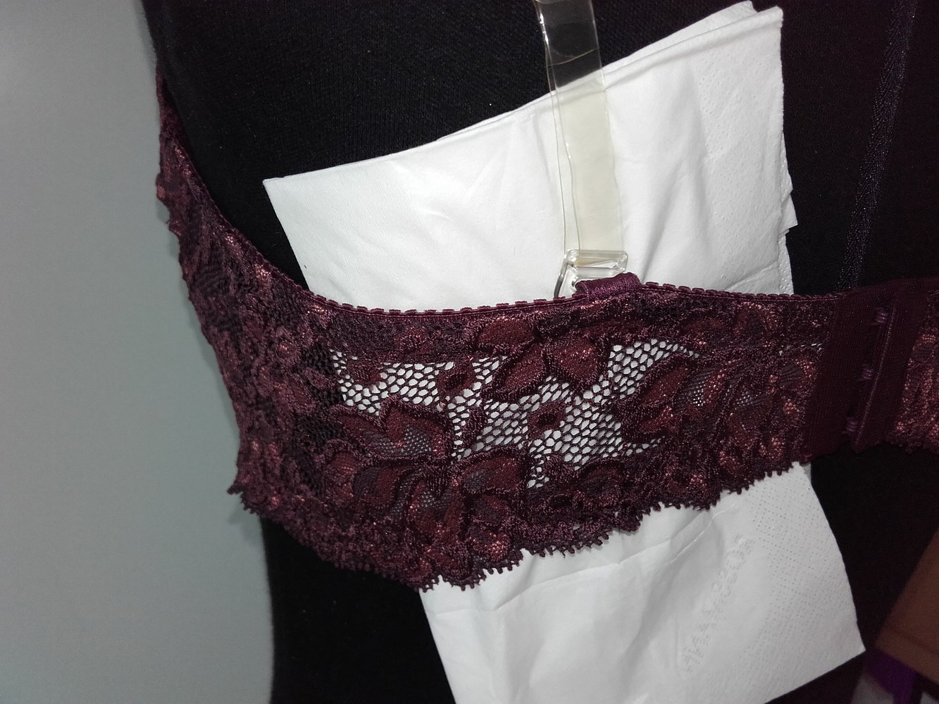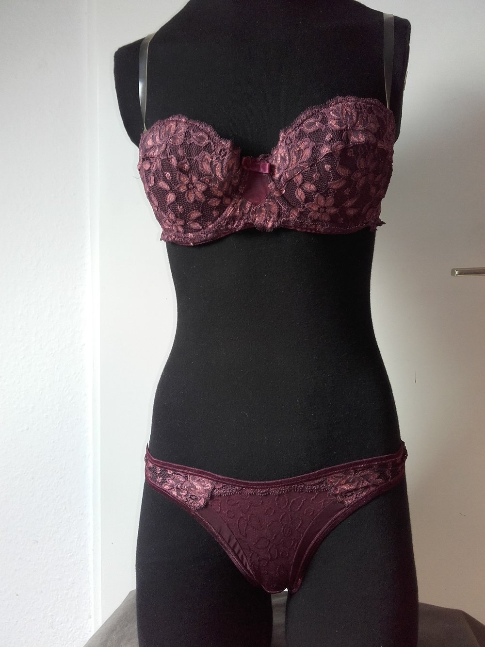 schönes dunkel lila Set(Farbe des dritten Bildes entspricht am besten der Realität, rest ist etwas überlichtet) . Der Slipist stellenweise und der BH auf der Rückseite in durchscheinender Spitze gehalten, beim BH ist eine Stoffschale hinter der Spitze, wodurch das Körbchen nicht durchscheinend ist. Zusätzlich hat der SlipNetzstoff an der Seite, der auch durchscheinend ist, die Rückseite ist komplett undurchsichtig.