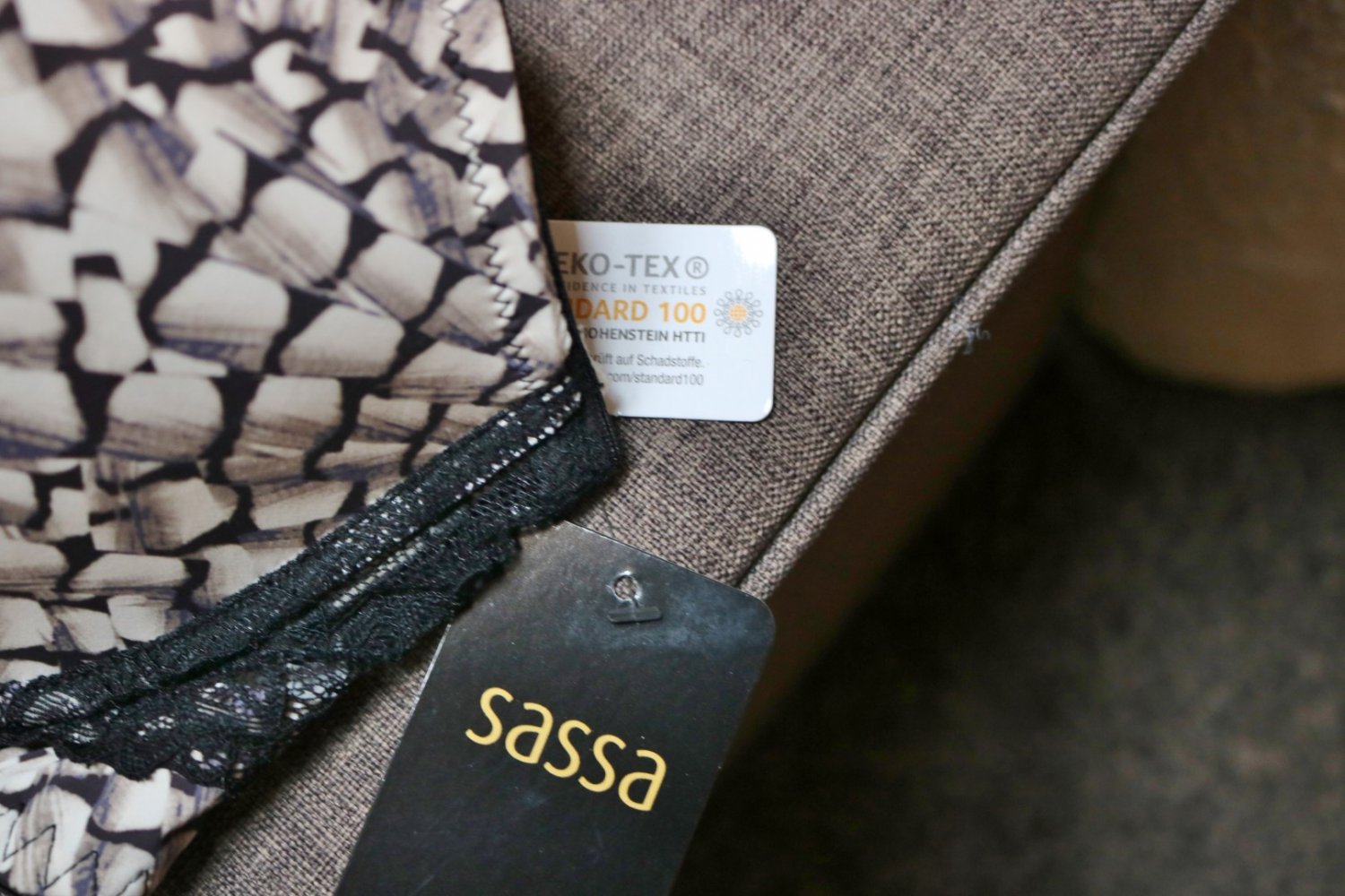 Schalen-BH mit Spitze, weiß-taupe-schwarz, Gr. 85 D, Marke: Sassa, neu mit Etikett, zauberhaftes Muster, kuschelweiche und hochwertige Markenqualität, hoher Steg, zu Schließen mit 3 Haken, Öko-Tex Standard 100 (geprüfte Qualität auf Schadstoffe), Material: 90% Polyamid, 10% Elasthan, Spitze: 90% Polyamid, 10% Elasthan
