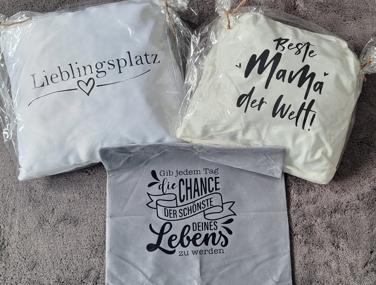 Ich biete Kissen oder Kissenbezüge mit verschiedenen Sprüchen oder nur ein Wort an.Kissen 6Euro Bezug 4Euro