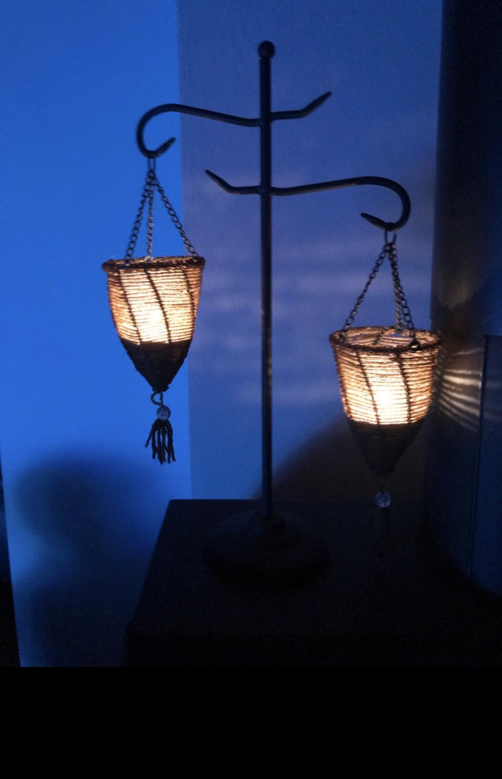 Schwarze Metall Halterung mit zwei Perlenhülsen Kerzenhalter Kerzenständer Vintage