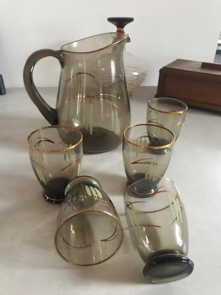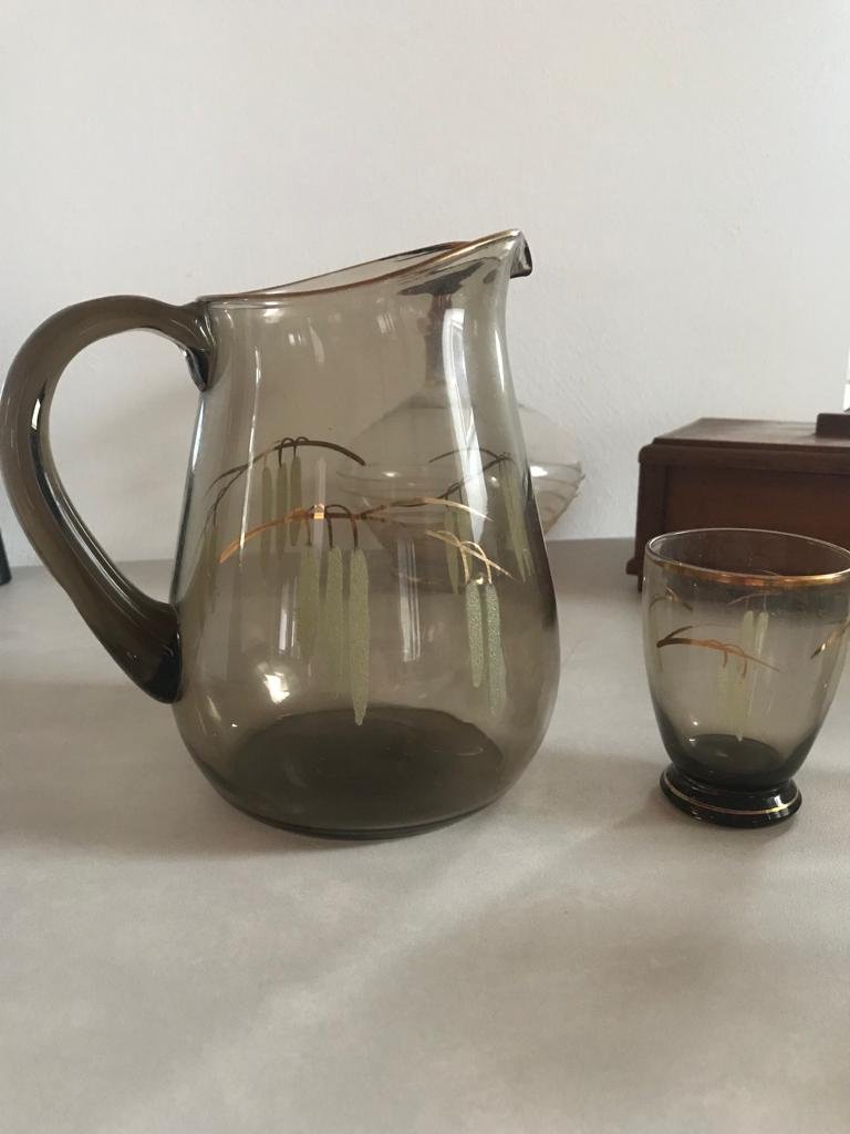 Krug Glas Henkelkrug 60s Rauchglas Set Motiv Ähre Midcentury Deko Bauhaus Aerea Cottage rare Karaffe Antik