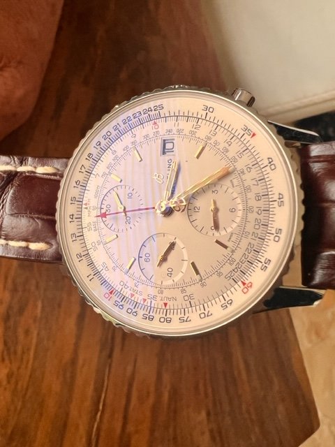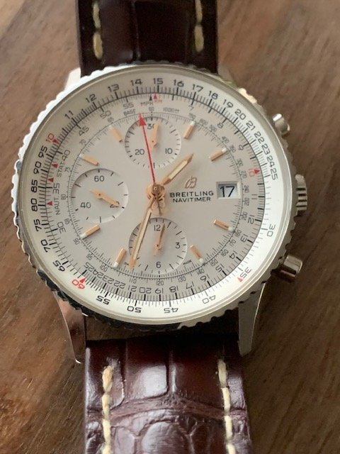 Die Navitimer Automatic 41 kombiniert raffiniert und elegant das historische Flair einer wahren Legende mit der Finesse eines modernen Zeitmessers. Breitling, eine Anlage fürs Leben. Anbei die Spezifischen Daten: Kaliber: Breitling 17; Automatikaufzug 38h, Gangreserve: 28800 a/h, 25 Rubine, Gehäuse: Edelstahl und 18-karätiges Rotgold Verschraubt, Wasserdicht: 3 bar, Bombiertes Saphirglas, beidseitig entspiegelt, Durchmesser: 41 mm, Dicke 9.9 mm, Höhe 41 mm, Armbandmaterial: Alligatorleder braun, NEU Wertig