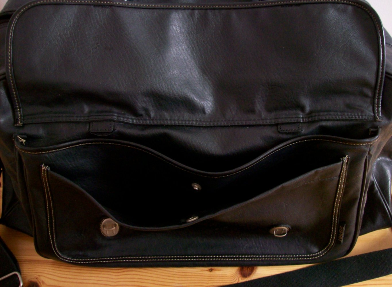- vorn 2 Einsteckfächer, hintereinander angebracht, geschlossen mit 2 Steckverschlüssen mit Zier- Schnallen