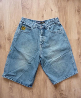 Coole kurze Baggy-Jeans von Illmatic Designz, Größe 32, hinteres rechtes Bein mit Logo des Labels bestickt